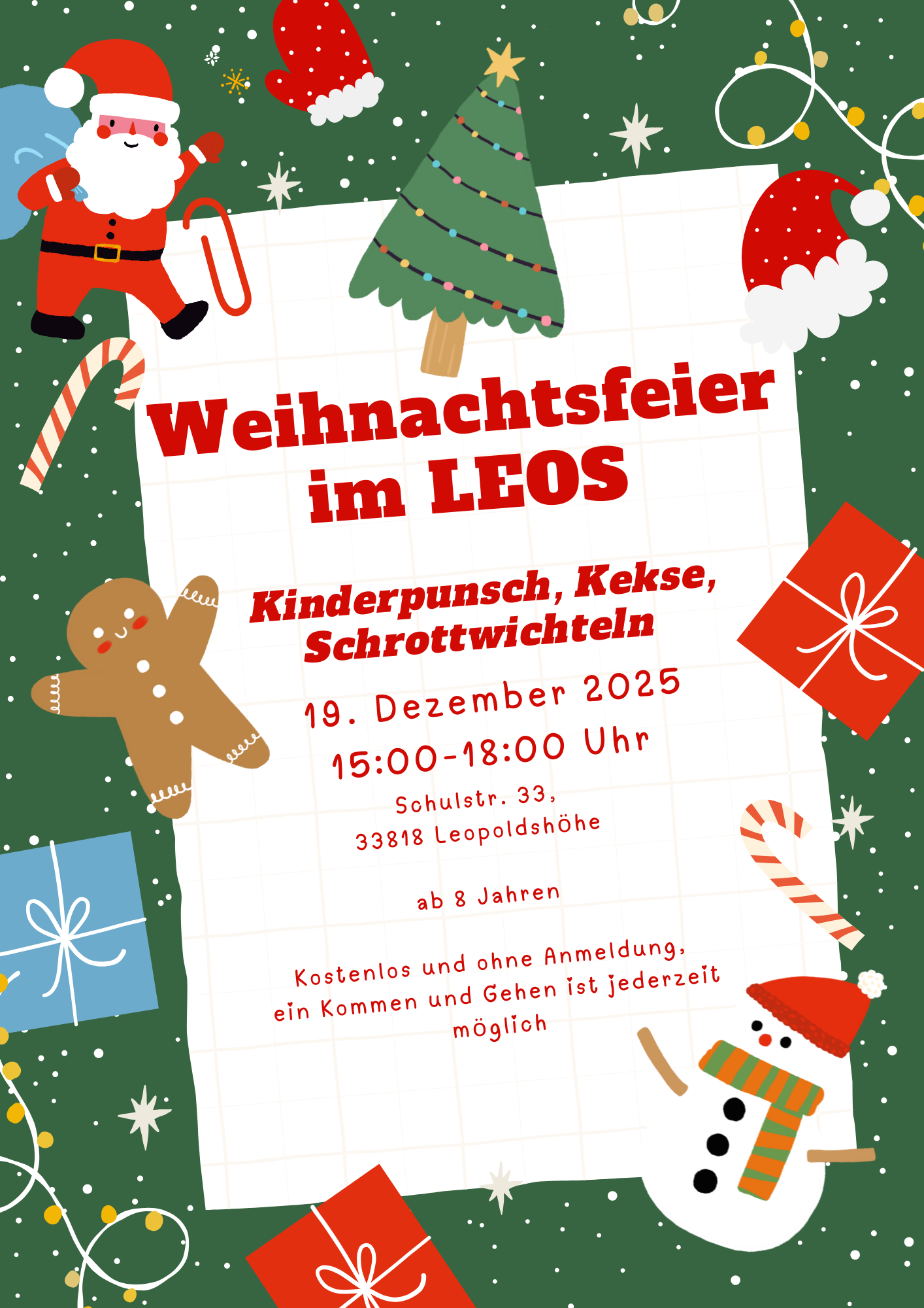 Am Freitag, den 19.12.2025 sind von 15:00 bis 18:00 Uhr alle herzlich eingeladen bei Kinderpunsch und Keksen zu quatschen, zu spielen und zu basteln und bei Bedarf auch noch ein Schrottwichtelgeschenk loszuwerden und mitzunehmen!