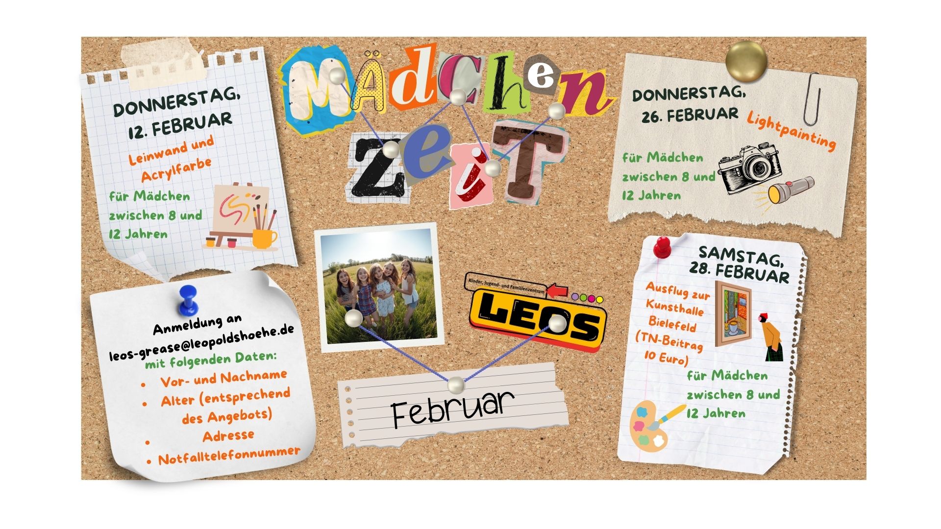 Ab Januar 2026 gibt es eine Änderung im Angebot „Mädchenzeit“: Jeder Monat steht unter einem neuen Motto. Jeden Monat gibt es an zwei Donnerstagen (i.d.R. zwischen 16:00 und 18:00 Uhr) ein kreatives Angebot im LEOS und einen Ausflug am Samstag – nur für Mädchen!!