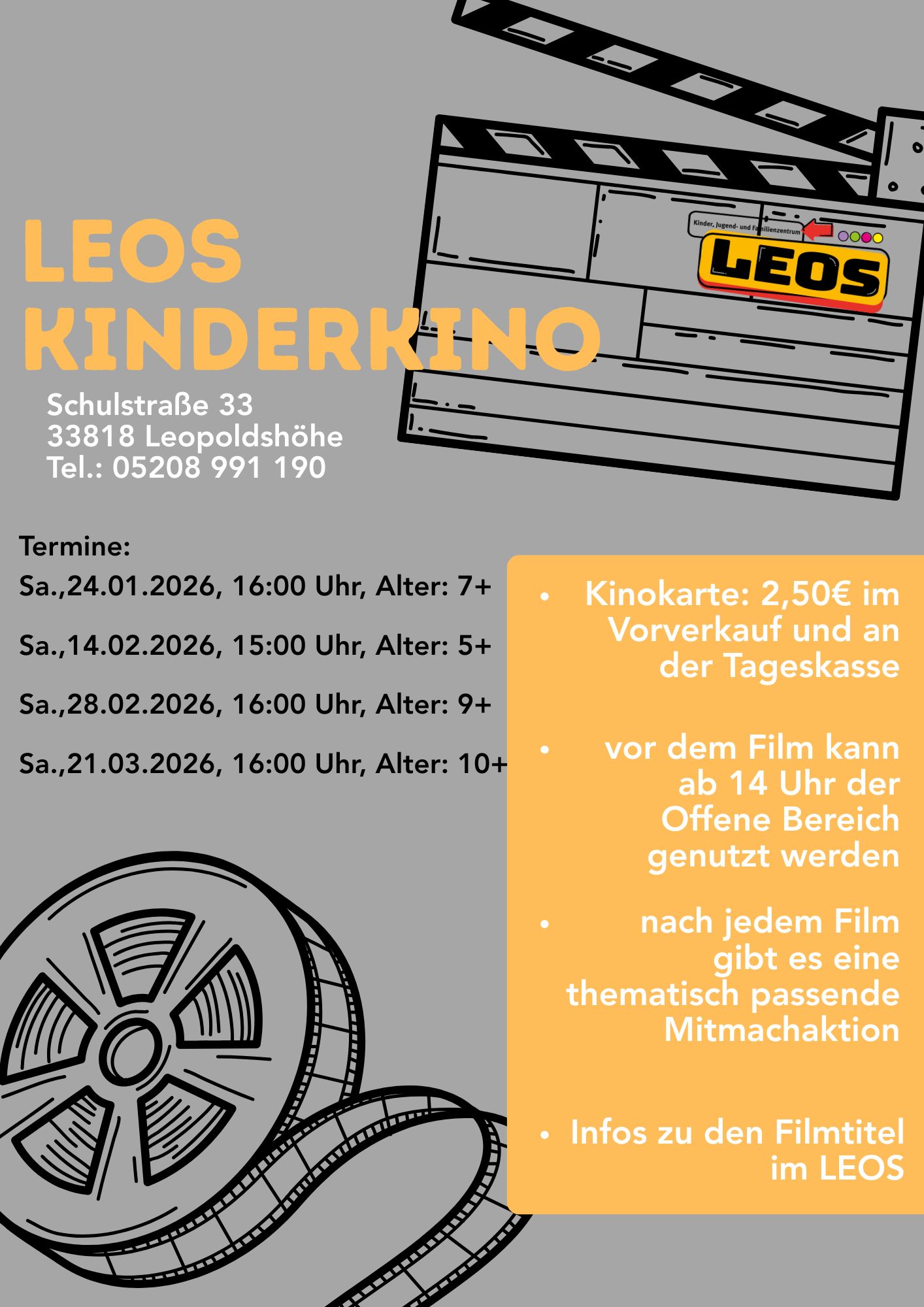 Das Kinder-, Jugend- und Familienzentrum LEOS zeigt ab Januar an ausgewählten Samstagen Kinofilme auf der großen Leinwand im Bistro. Termine: Sa., 24.01.2026, 16:00 – ca.18:30 Uhr, Alter: [...]